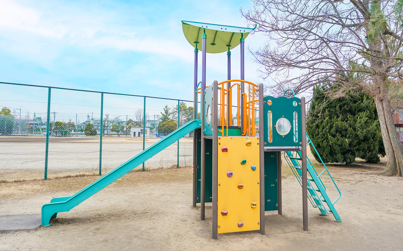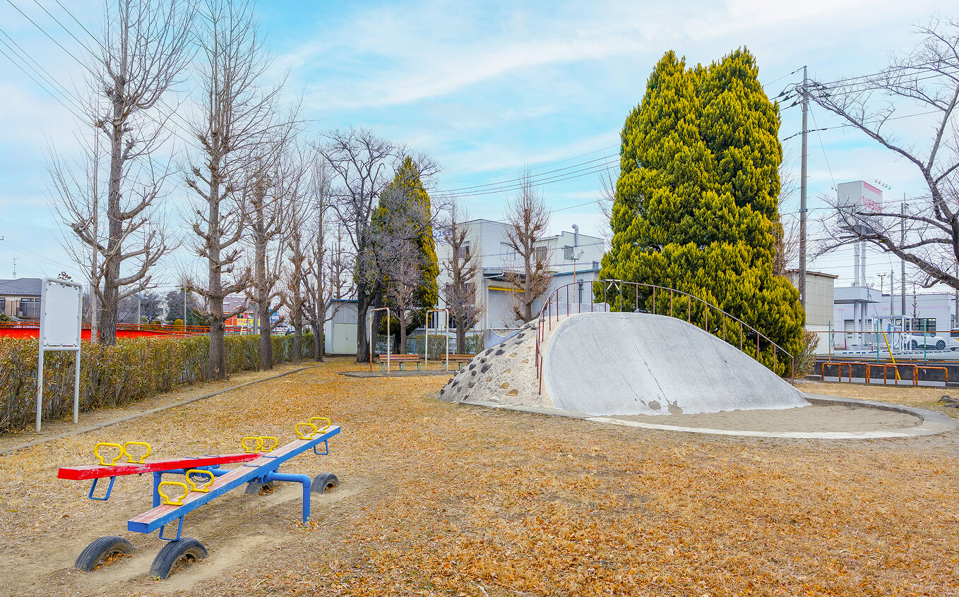 南栄町グラウンドに隣接する公園で、グラウンドを見渡せる立地です。園内には山型滑り台やブランコなどの遊具が設置されています。