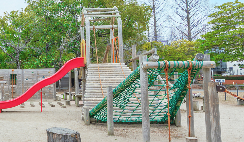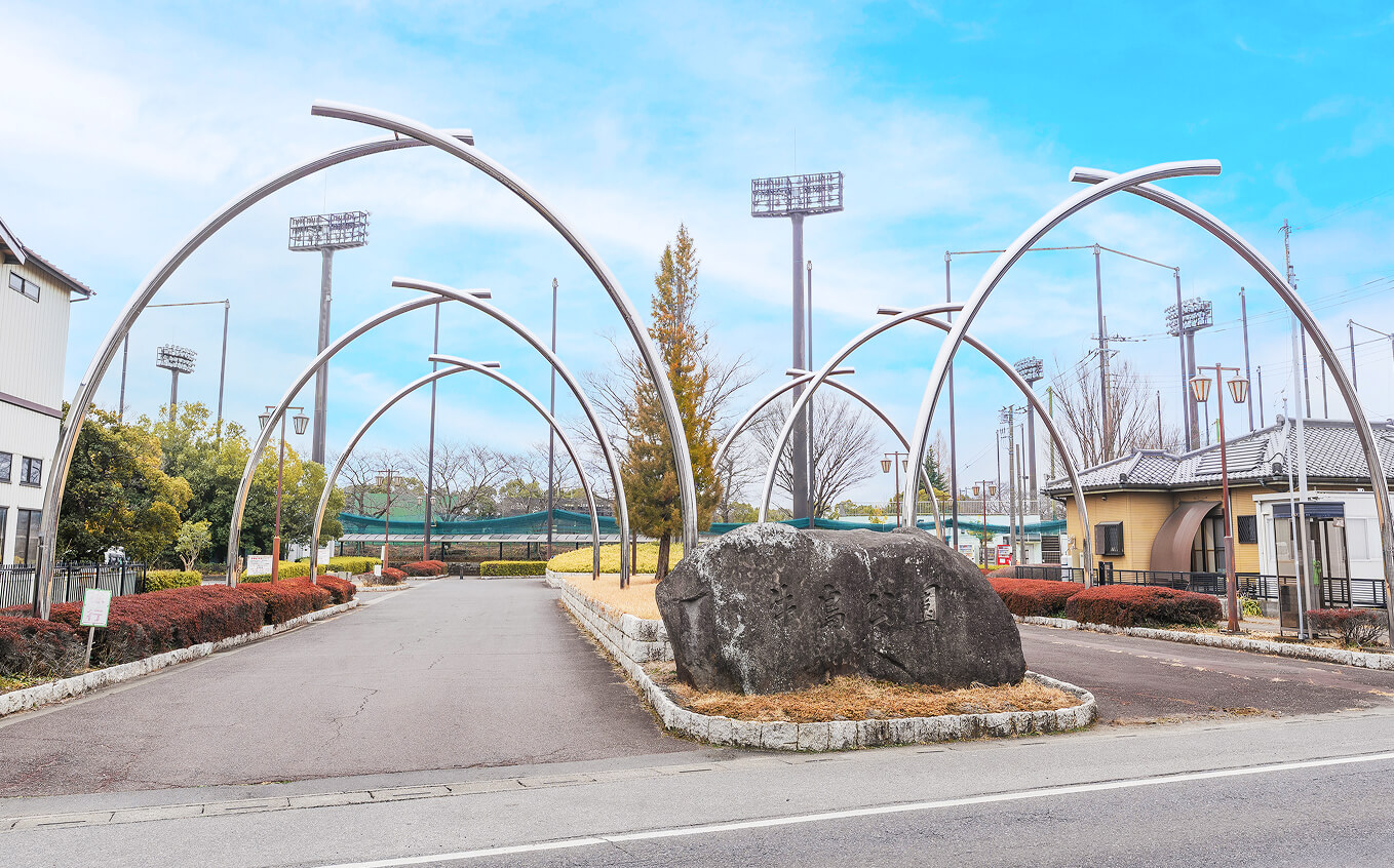 滑り台などの遊具がある広場に併設して、牛島野球場があります。野球場はスコアボード、照明、放送設備、スタンドを備え、さまざまな大会の会場として使用されています。