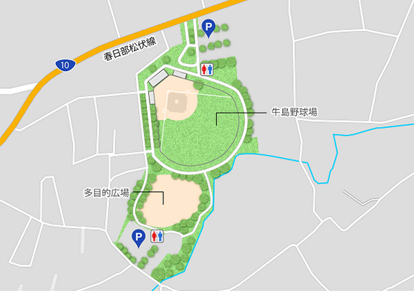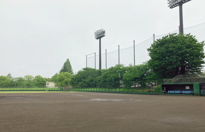 Adjacent to a playground area with slides and other equipment, Ushijima Baseball Field is equipped with a scoreboard, lighting, a public address system, and stands, and is used as a venue for various tournaments and competitions.