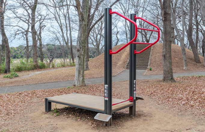 雑木林の中に、リニューアルした健康遊具が並ぶアスレチックコースです。自然の起伏を活かした多彩なステップや遊具で、大人から子供まで楽しみながら体力づくりや健康増進に取り組めます。