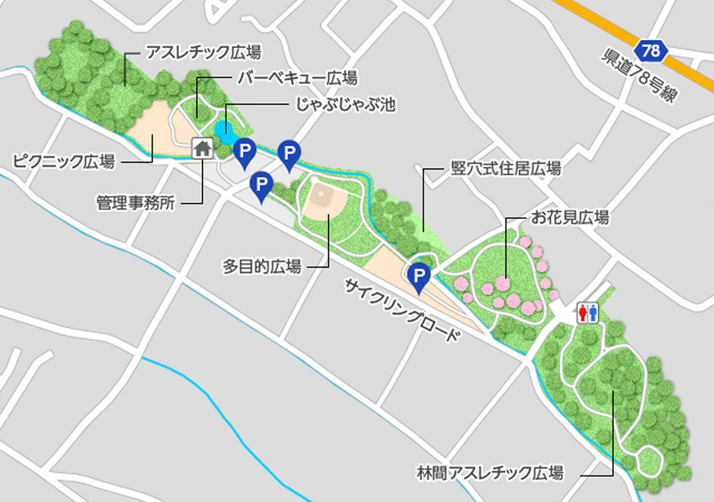 バーベキュー施設ご利用の方は、管理事務所又は多目的広場脇の駐車場が便利です。