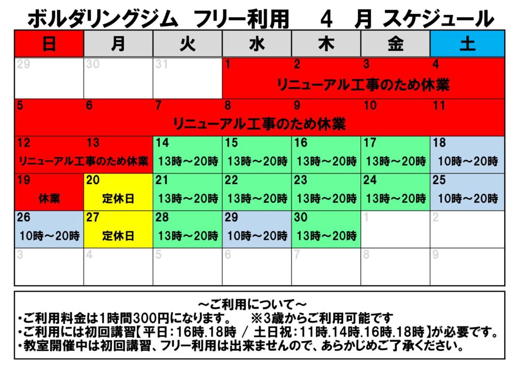ボルダリングスケジュール 令和8年4月